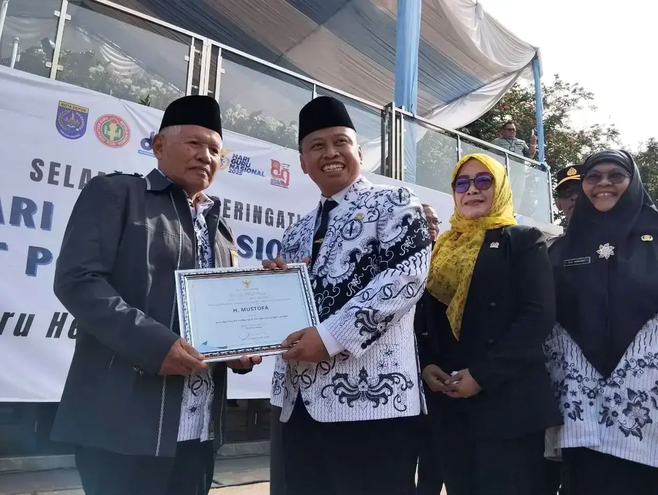Wali Kota memberikan penghargaan kepada Mustofa, mantan Guru Agama di SDN Kalimulya 4 (Foto :Diskominfo Depok)