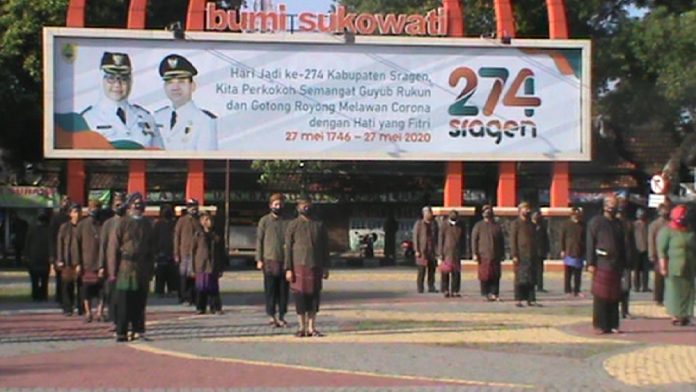 uklik.net – SRAGEN – Hari Jadi Kabupaten Sragen yang jatuh pada tanggal 27 Mei kali ini digelar dengan suasana berbeda dengan tahun tahun sebelumnya. Upacara peringatan tetap berlangsung di alun-alun kabupaten, dengan sederhana dan menerapkan protokol covid-19 yang dipimpin Bupati Kepala daerah Kabupaten Sragen.