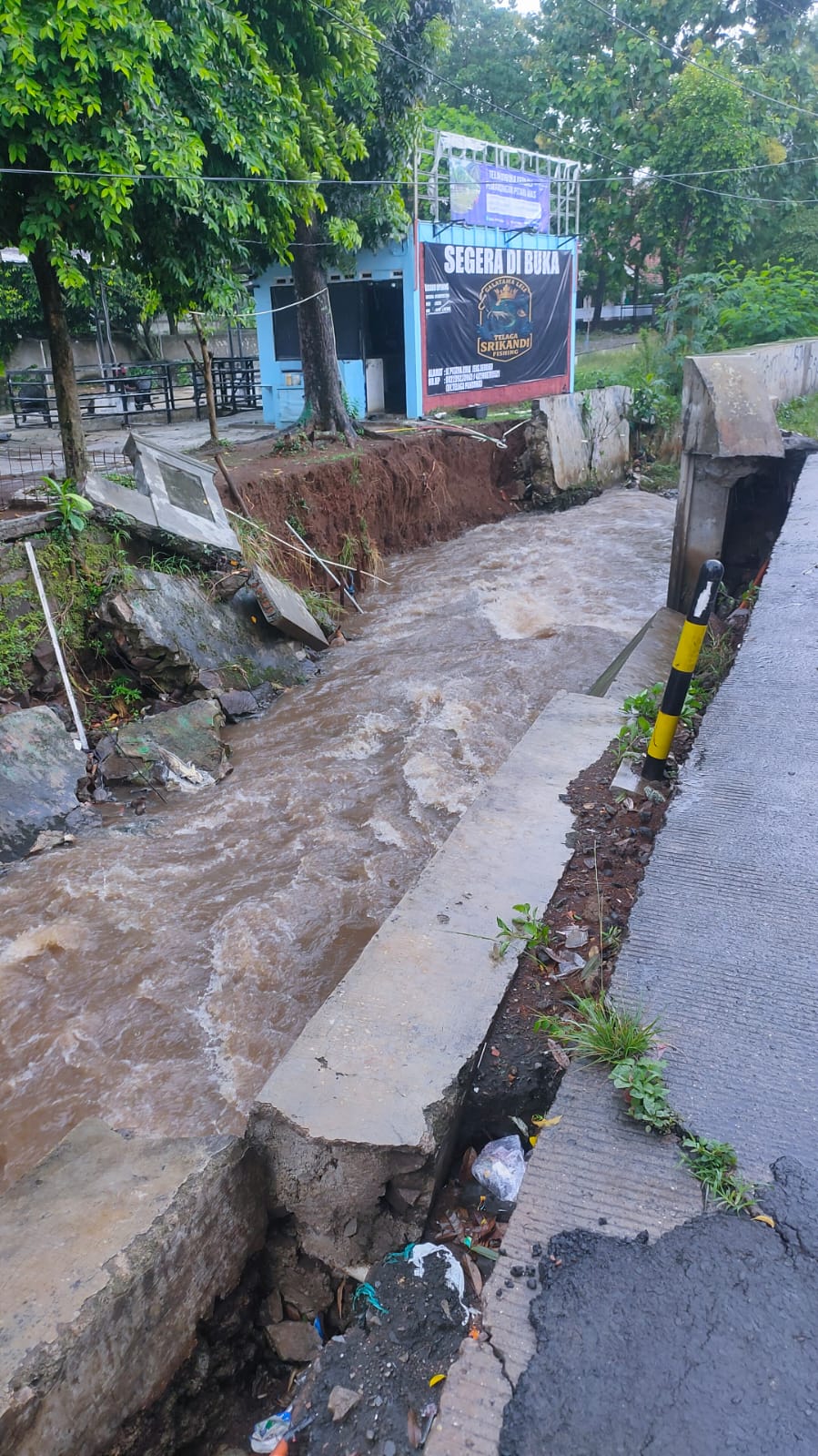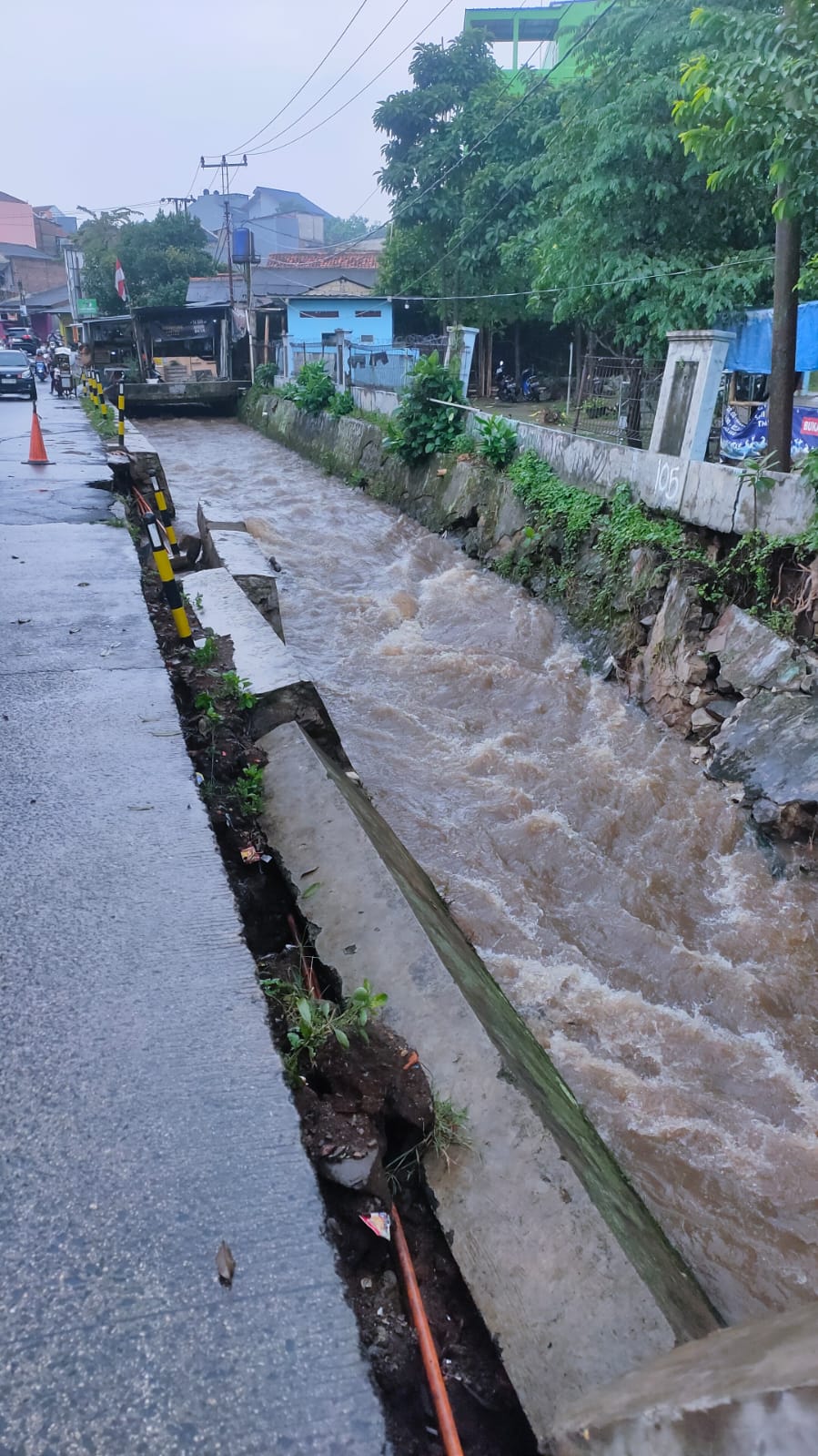 uklik.net- Akibat hujan deras, Pembatas Jalan Raya Pitara Kali Pitara dekat jembatan Sengon, depan pemancingan Seroja, Pancoran Mas, Kota Depok mengalami amblas. Hal ini sangat membahayakan pengguna jalan yang melintas.