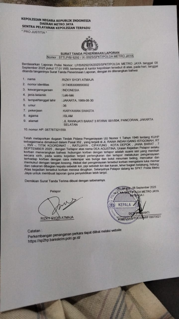 Pasalnya Korban Rizky Tile telah melaporkan DA ke ruang pengaduan Sentra Pelayanan Kepolisian Terpadu (SPKT) Polda Metro Jaya, pada Senin (08/09/25) sore dengan no Laporan Polisi LP/B/6292/IX/2025/SPKT/Polda Metro Jaya dan laporan nya telah dilimpahkan ke Polres Metro Depok hingga saat ini terkesan jalan ditempat.