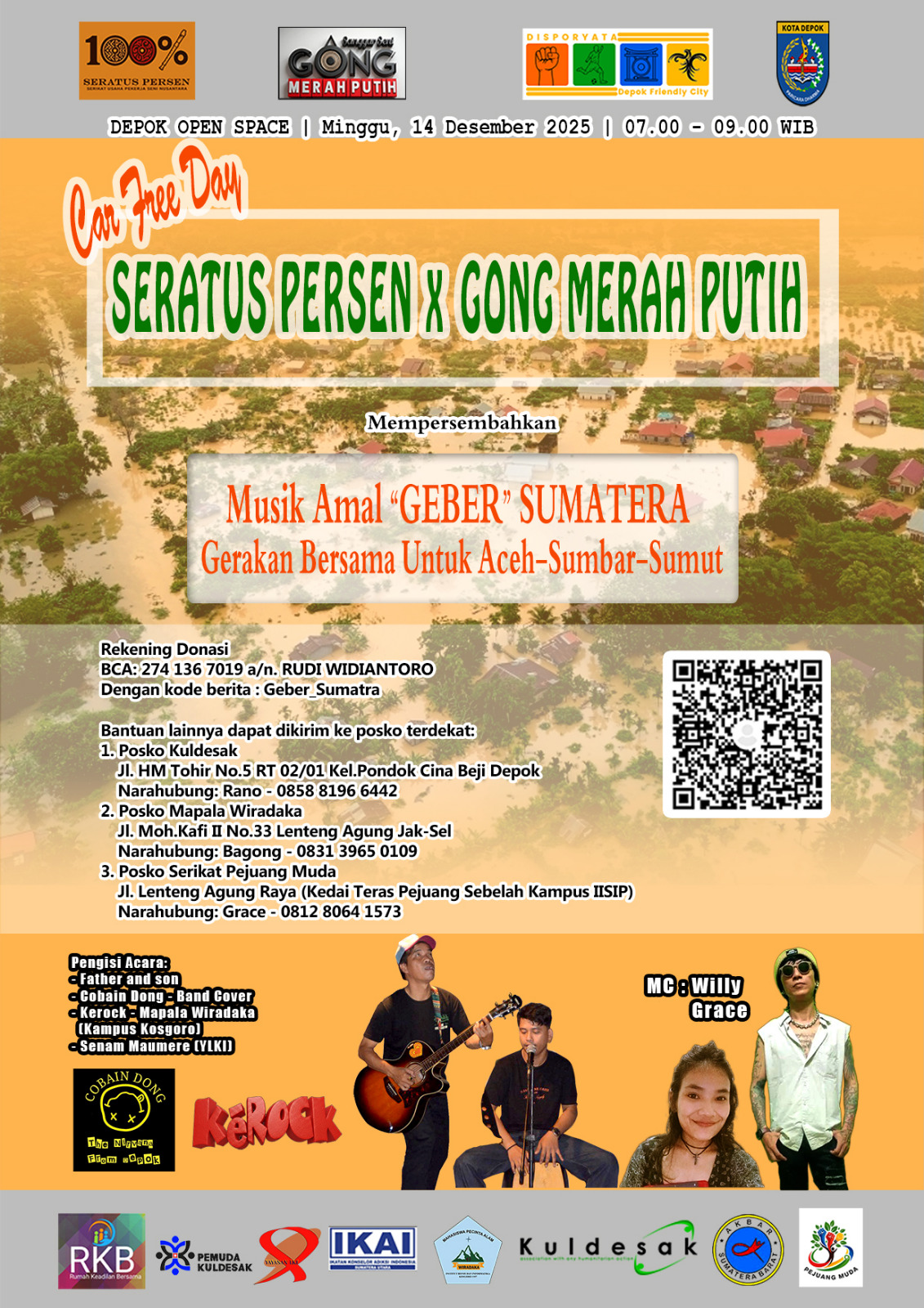 Uklik.net— Suasana kebersamaan dan kepedulian terasa kuat di kawasan Depok Open Space pada Minggu (14/12/2025), saat Musik Amal “GEBER Sumatera”, Gerakan Bersama untuk Aceh, Sumut dan Sumbar digelar oleh Seratus Persen berkolaborasi dengan Gong Merah Putih.