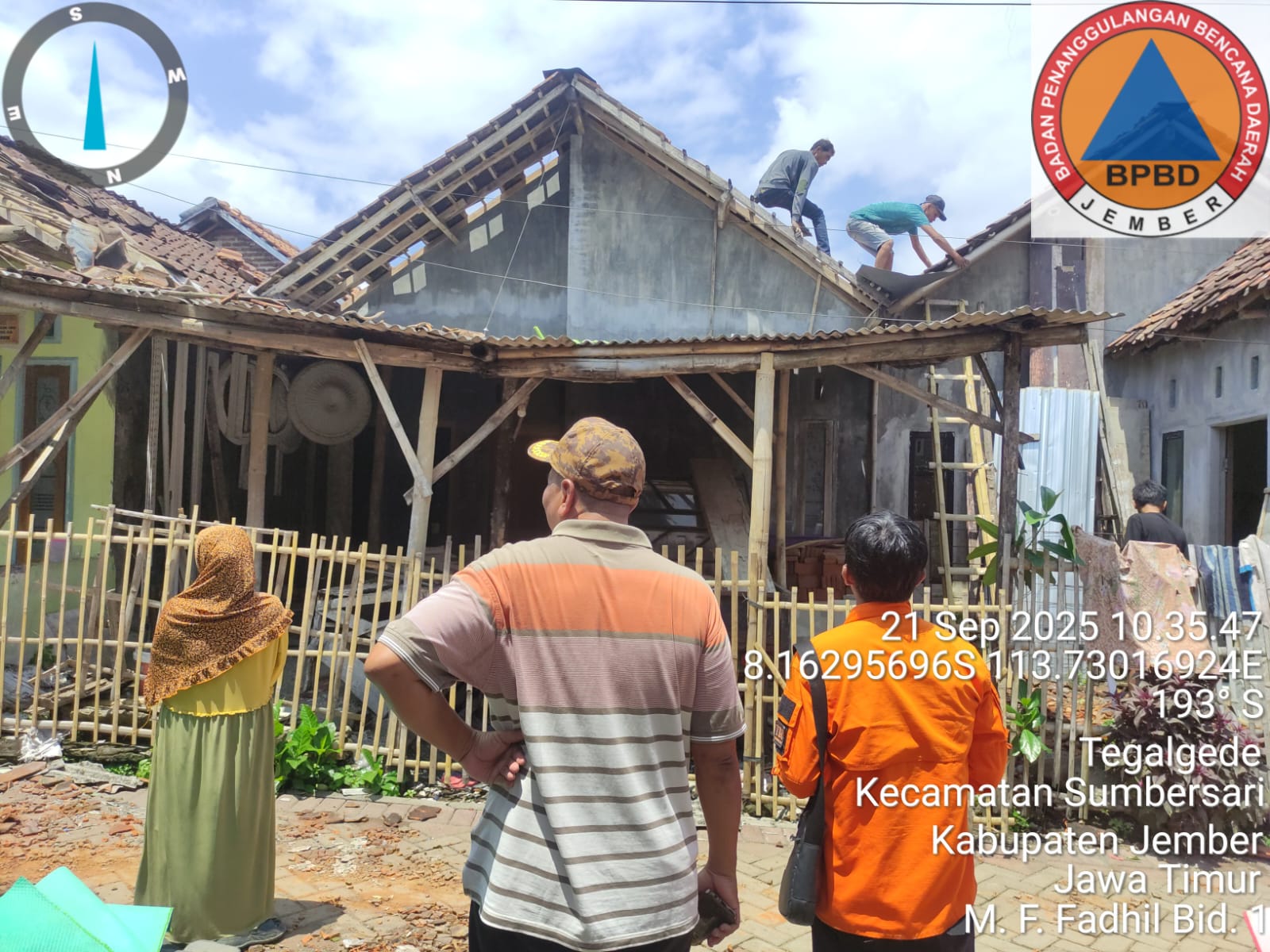 Laporan pertama datang dari wilayah Jawa Timur. Badan Penanggulangan Bencana Daerah (BPBD) Kabupaten Jember melaporkan kejadian angin kencang menerjang tiga kelurahan di Kecamatan Sumbersari pada Minggu (21/9), pukul 14.00 WIB. Tiga kelurahan terdampak antara lain Sumbersari, Karangrejo dan Tegal Gede.