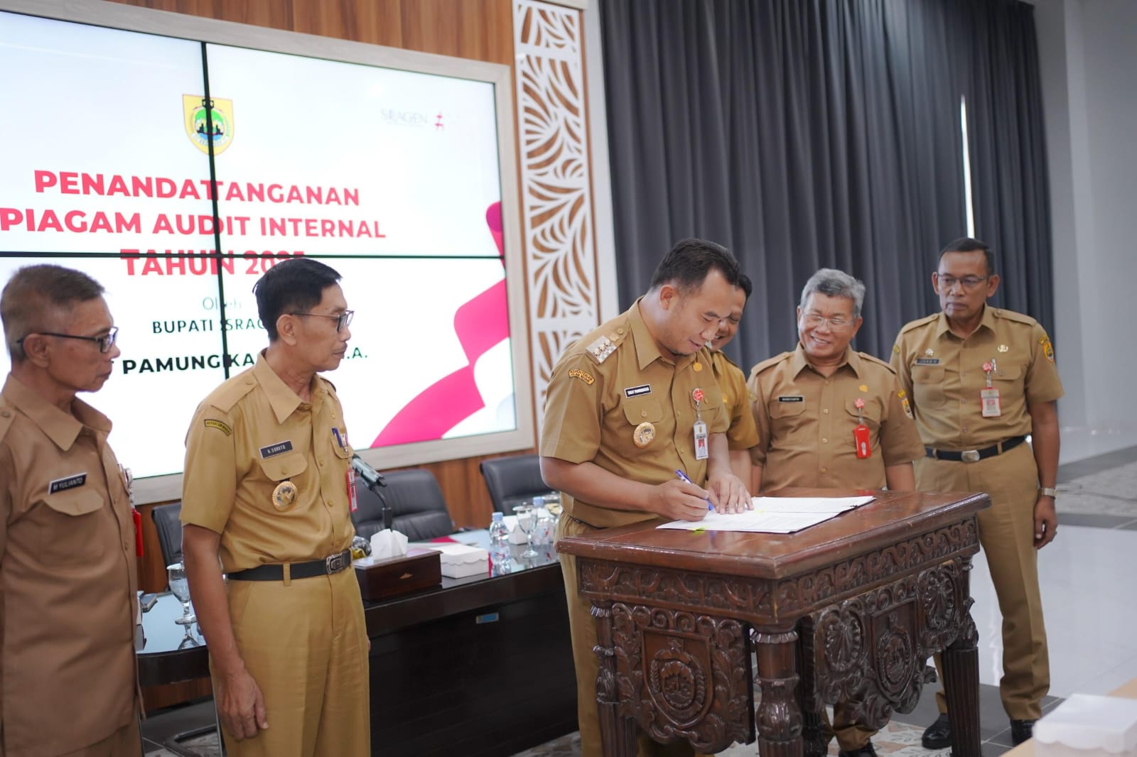 uklik.net – SRAGEN – Pemerintah Kabupaten Sragen menegaskan komitmen penguatan fungsi pengawasan internal melalui penandatanganan Internal Audit Charter (IAC) oleh Bupati Sragen, Sigit Pamungkas. Penandatanganan dilakukan usai Rapat Evaluasi Kegiatan TA. 2025 yang digelar di Aula Lantai 4 Gedung Kantor Terpadu Pemkab Sragen, Senin (22/9/2025).
