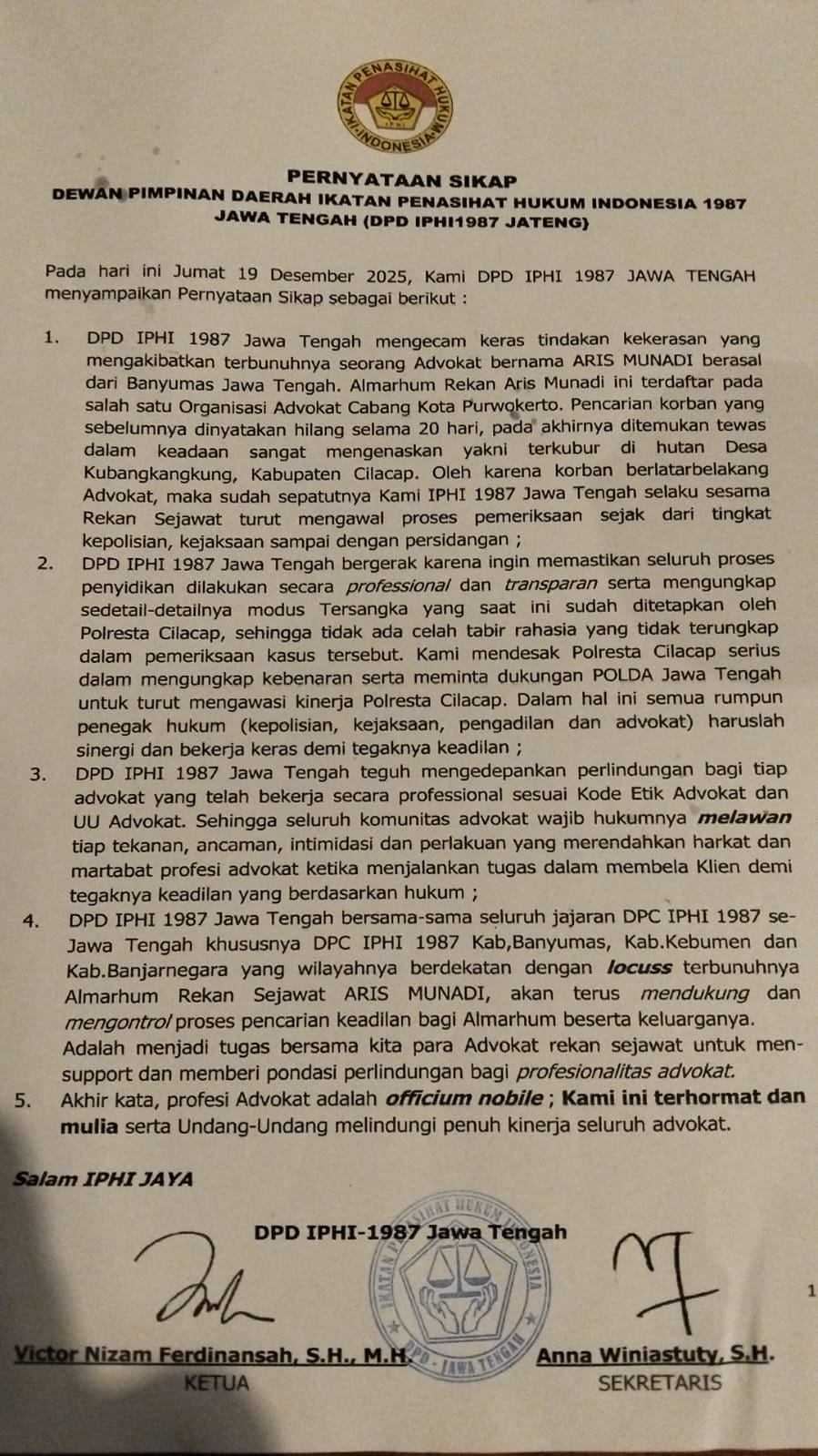 Sebagai informasi, pengacara sekaligus anggota DPC Perhimpunan Advokat Indonesia (Peradi) Purwokerto, Aris Munadi, ditemukan tewas dan dikubur secara tidak wajar di kawasan hutan jati Desa Kubangkangkung, Kawunganten, Cilacap. Aris dilaporkan hilang kontak sejak 22 November 2025.