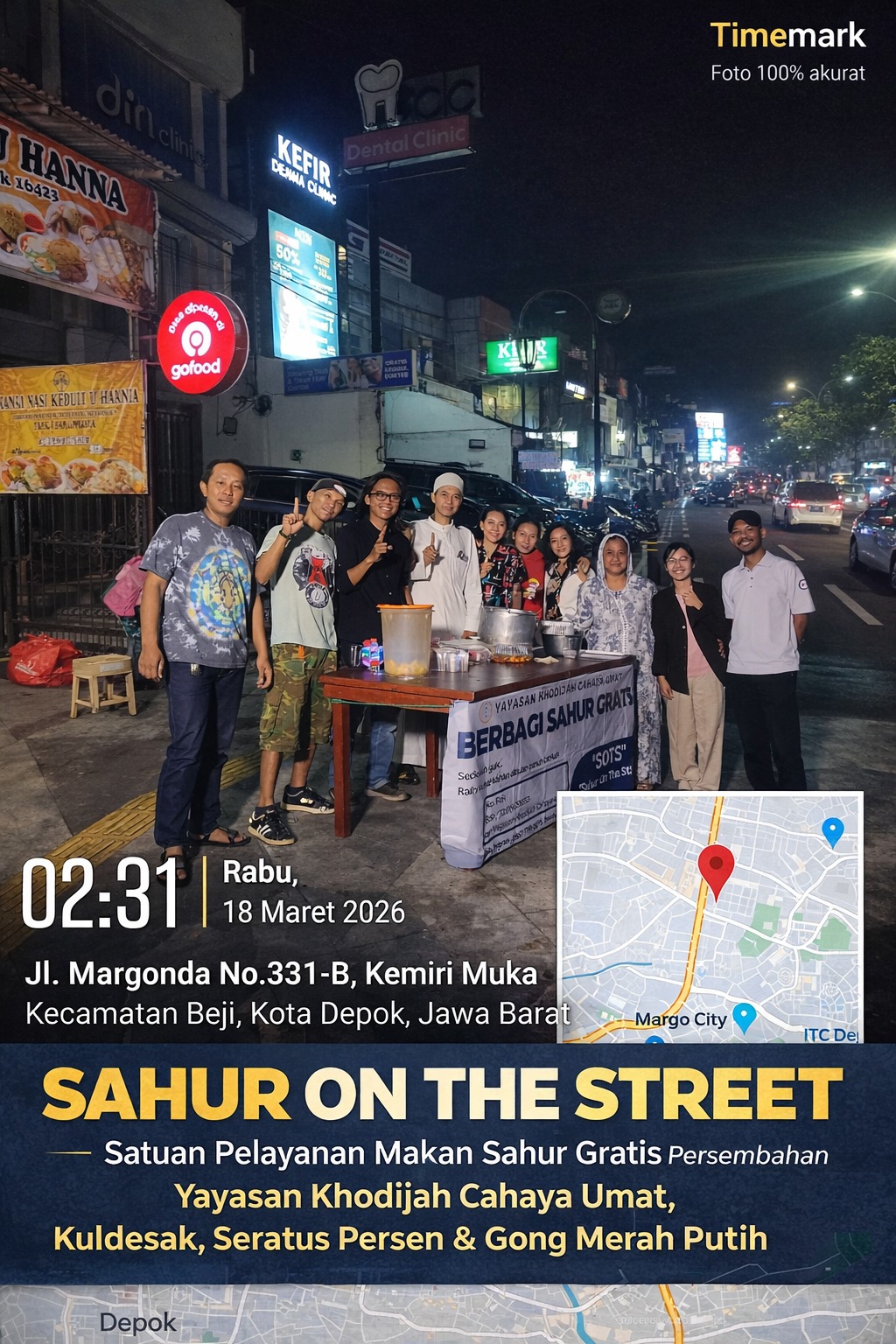 Uklik.net – Program kemanusiaan “Sahur On The Street: Sahur Bareng Warga Margonda, Bangunin Sahur, Bangunin Kepedulian” resmi berakhir pada Kamis dini hari, 20 Maret 2026, setelah berlangsung selama lima hari berturut-turut sejak 15 Maret 2026 di Jalan Margonda Raya No.331, Kemirimuka, Depok.